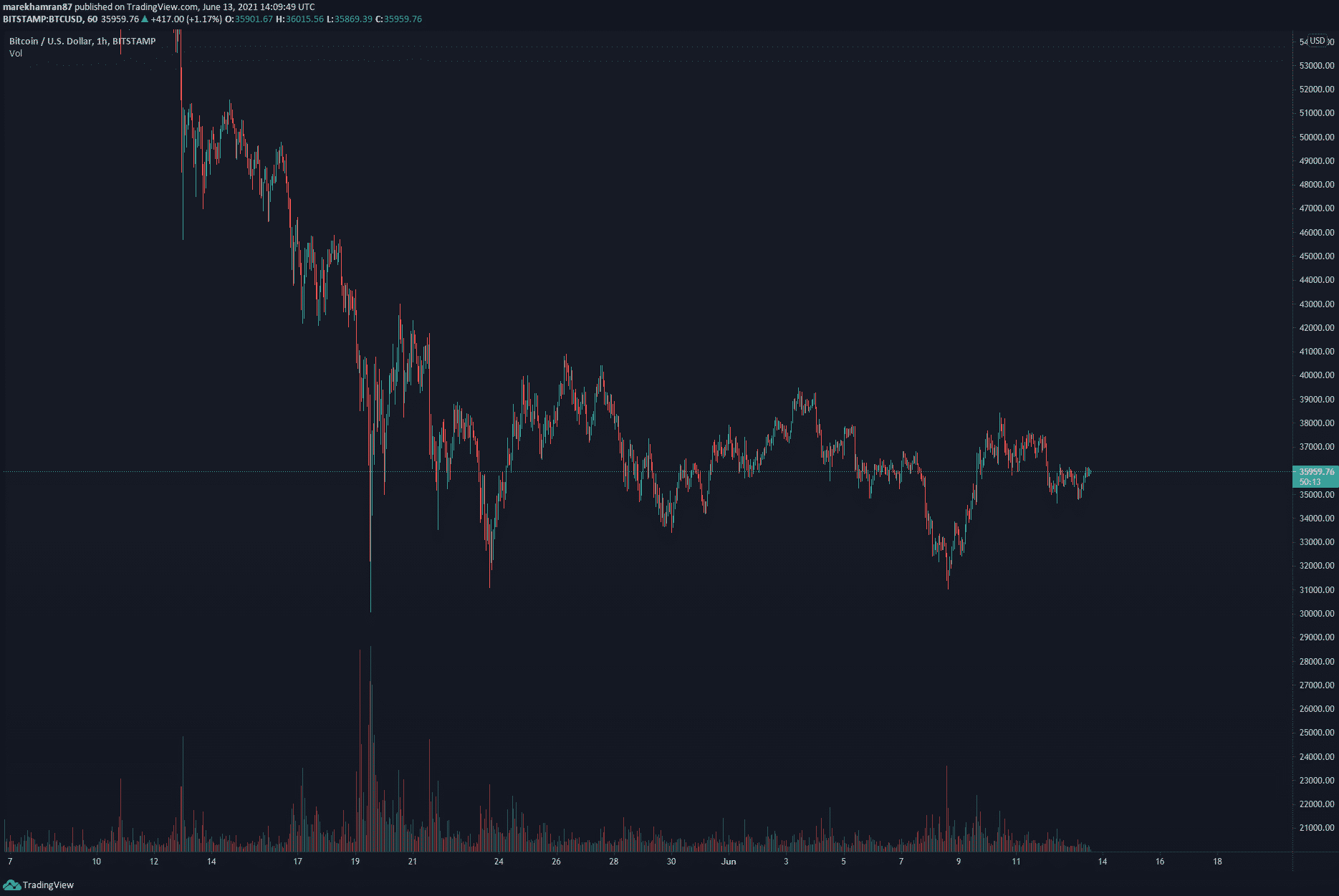 „Bitcoin stále drží trh na uzde, keďže sa neustále pohybuje medzi týždenným supportom na úrovni 32 000 a blízkou rezistenciou 200 MA, ktorá je v súčasnosti na úrovni 42 000 USD. Neistota, ktorá panuje po nedávnej korekcii, a obavy okolo vyhlásenia prezidenta Bidena na summite G7 držia cenu Bitcoinu stále v nižších hladinách.”