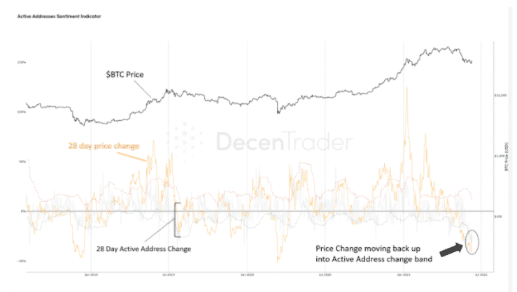 „Rovnaký signál sme zaznamenali aj včera, čo naznačuje, že cena BTC bola v porovnaní s aktívnymi adresami prepredaná. To znamená, že by sa Bitcoin mohol v priebehu nasledujúcich týždňov odraziť.”