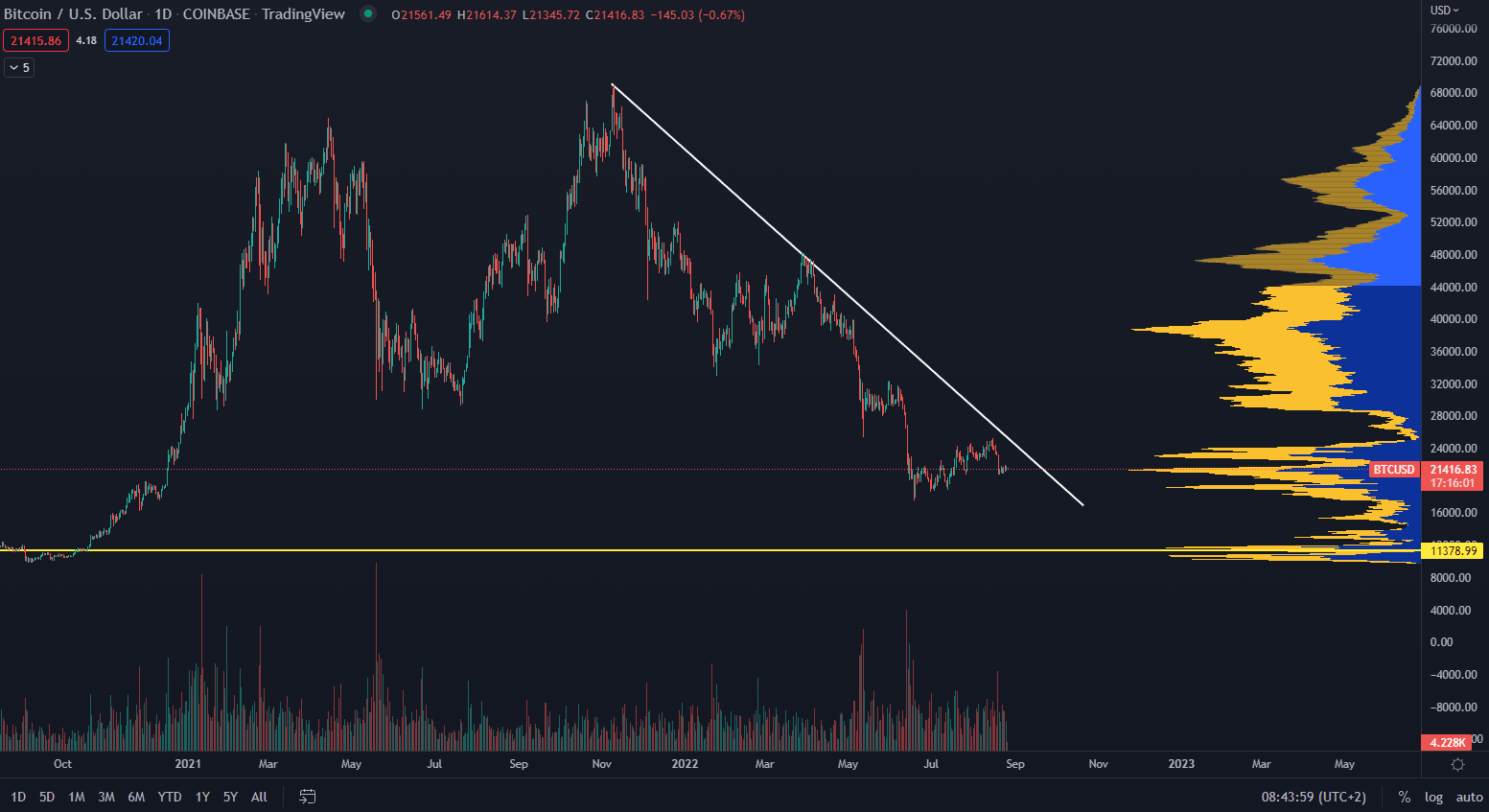 Bitcoin sa aktuálne nachádza v štruktúre dlhodobej korekcie a zdá sa, že sa blíži k rozhodujúcemu momentu, ktorý určí, kam bude cena hlavnej kryptomeny smerovať. Cena sa nachádza na hladine 21 400 dolárov v čase písania článku a osciluje na tejto zóne, kde bojujú nakupujúci a predávajúci tesne po nedávnom výplachu.