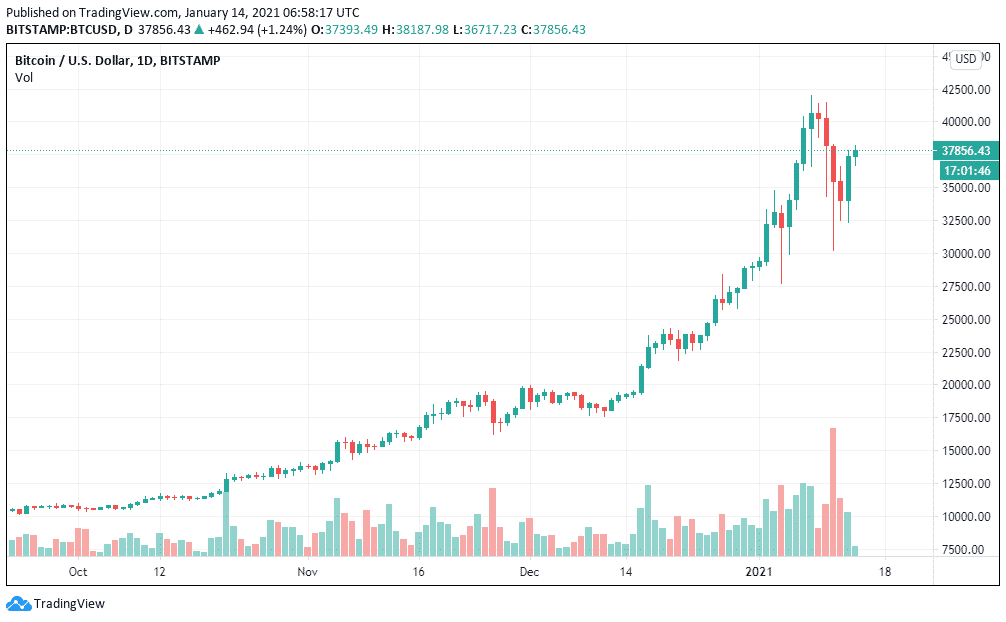 Kapitalizácia všetkých kryptomien dnes opäť prekonala jeden bilión dolárov a Bitcoin pred chvíľou otestoval hladinu 38 000 $. Za posledných 24 hodín tak spravil zisk 15% a je dosť možné, že v priebehu štvrtka to potiahne ešte o dve tisícky vyššie. Bude veľmi zaujímavé sledovať čo sa stane, až sa na burzách objaví okrúhla cena 40 000 $. Nastane odmietnutie? Alebo Bitcoin preletí cez $40k ako nôž maslom? Alebo nebodaj budeme zase týždeň konsolidovať a potom sa uvidí?