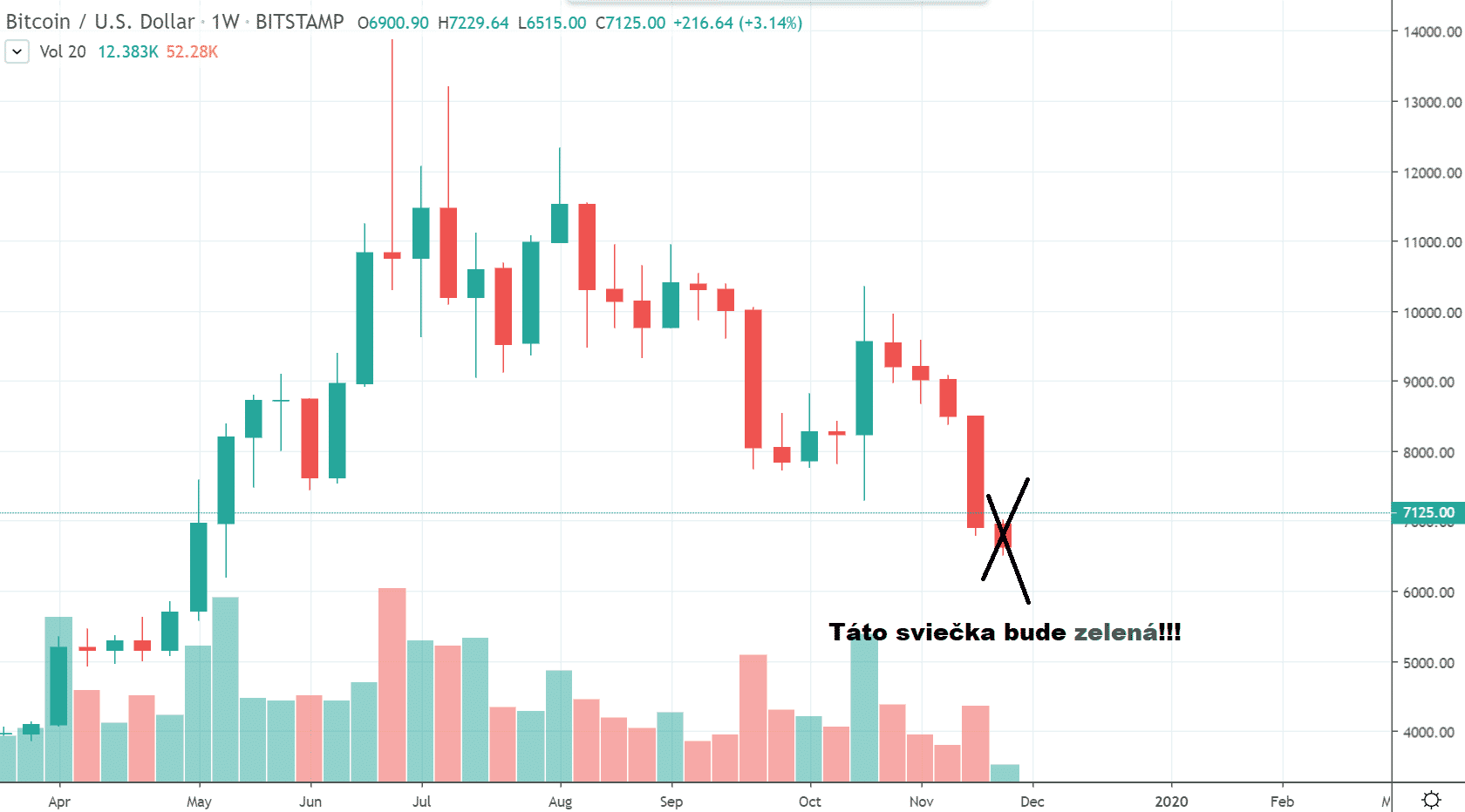 Pri pohľade na graf Bitcoinu mi ráno skoro vypadli oči. 7000 $ bolo prekonaných a okolo siedmej sem dokonca testovali 6500 $. Potom som si však prepol pohľad na weekly graf a upokojil som sa. Uvidel som totiž päť červených sviečok v rade. Tento jav sa na páre BTC/USD neukázal už dobrých päť rokov. A ja neverím, že Bitcoin je na tom až tak zle.