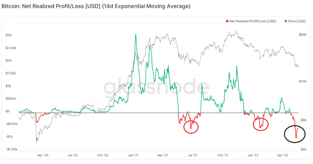 Indikátor čistého realizovaného zisku/straty (NRPL) ukazuje, že kapitulačná udalosť (čierny kruh) z 12. mája bola najvyššia v histórii a zaznamenala stratu vo výške 1 miliardy $.