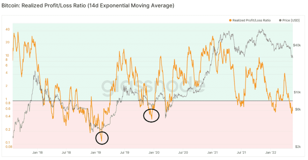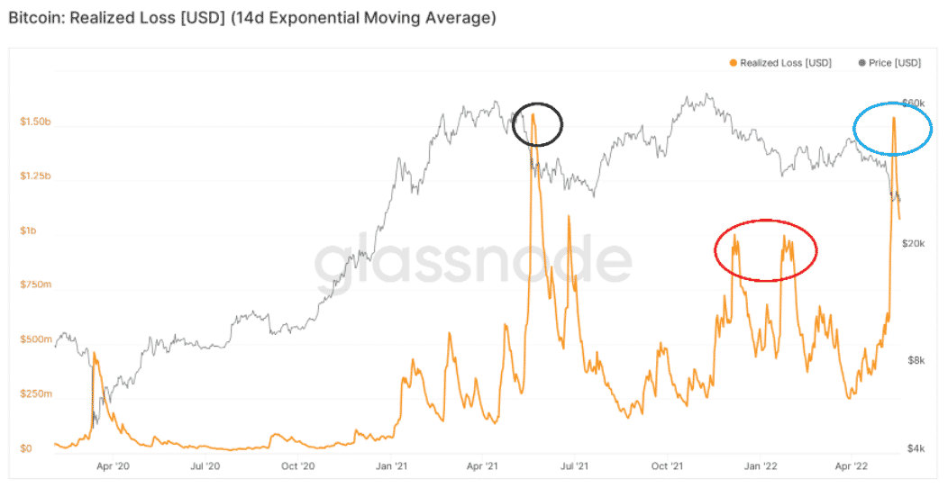 Realizované straty vyvrcholili v decembri 2021 a vo februári 2022 blízko 1 miliardy $ dvakrát (červené krúžky). K hodnoteniu došlo po poklese z historického maxima z novembra 2021. Keďže hodnota bola podstatne nižšia ako v máji 2021, zdalo sa, že nie všetci kupujúci ATH kapitulovali.