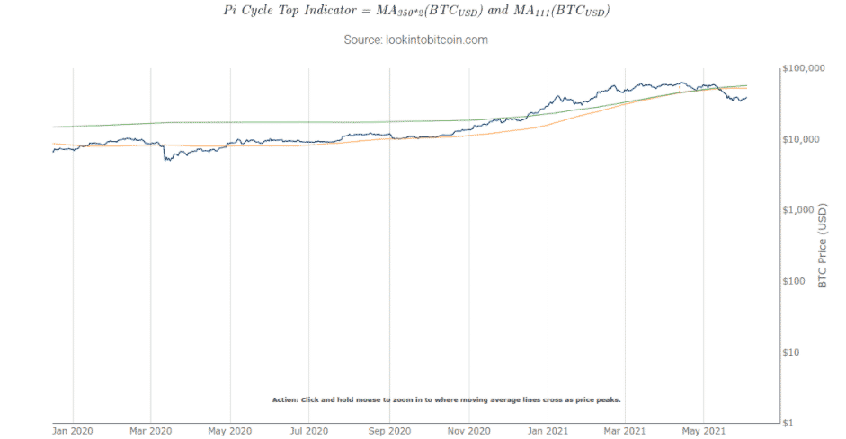 Pi Cycle Top využíva dva kĺzavé priemery. Konkrétne 111 – dňový a 350 – dňový priemer vynásobený dvoma pre určenie pravdepodobných vrcholov trhu. Ukázalo sa, že je extrémne presný. Aktuálne podmienky na trhu vytvárajú prekríženie týchto dvoch priemerov. Tento fakt nám naznačuje ďalší návrat na býčiu vlnu.