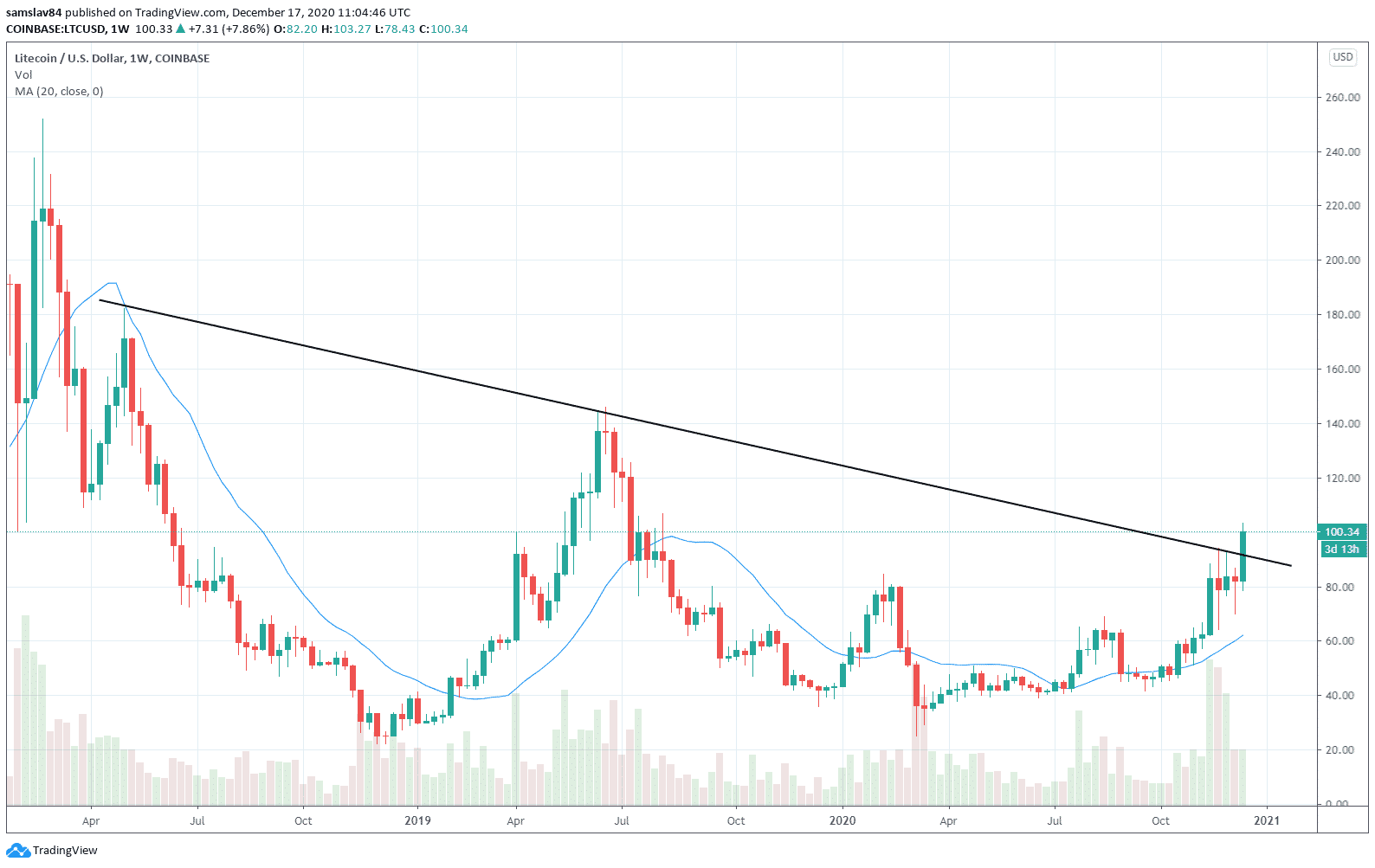 Alty dnes majú doslova párty. Zatiaľ čo Bitcoin vytvoril za posledných 24 hodín zisk 16%, niektoré kryptomeny dosahujú oveľa vyššie hodnoty. Litecoin dnes prvýkrát od leta 2019 prekonal magických 100 $ a majitelia týchto coinov sú v zisku 26%. Aj XRP má zas sebou 25% pumpu a obchoduje sa za 56 centov – 30 centov pod maximom z novembra 2020.