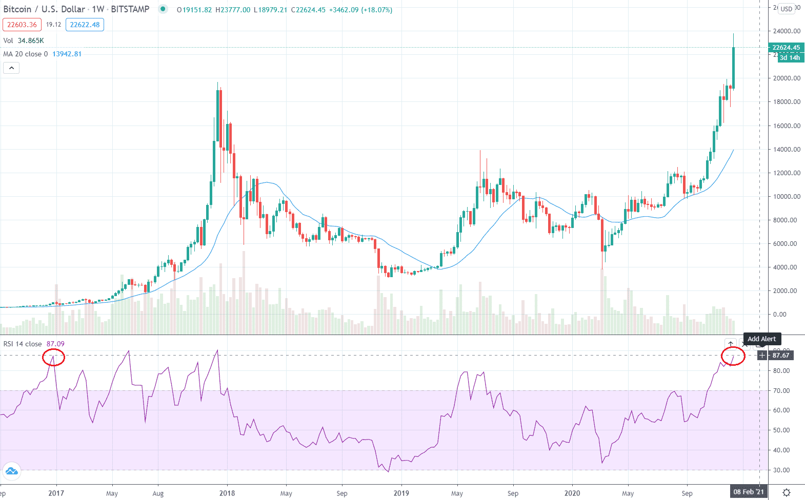Ako sme spomínali včera na streame s Jaroslavom, pri dosiahnutí 24 000 $ RSI na weekly grafe dosiahol hodnotu 90 bodov. Tak vysoko sme naposledy boli počas najväčšieho HYPU v roku 2017 a je málo pravdepodobné, že by sme išli vyššie. Iste, Bitcoin chvíľami v roku 2013 dosahoval aj vyššie hodnoty RSI, vtedy sa však jeho hodnota pohybovala v rozmedzí niekoľkých stoviek dolárov a bol ľahko manipulovateľný.
