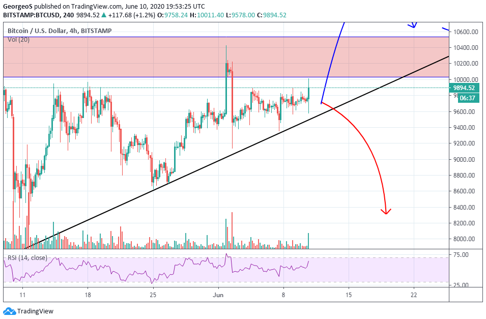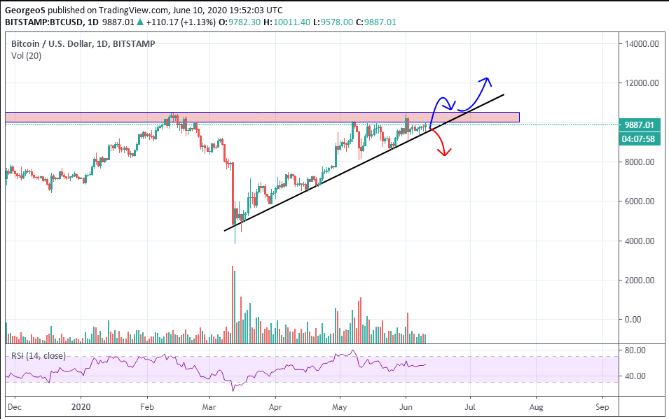 Momentálne by sme mohli ísť teda jemne hore smerom k hranici 10 000 dolárov. Otvárať tu teraz short alebo long je z môjho pohľadu ale úplne zbytočné a zároveň vysoko riskantné vzhľadom nato, že teraz môže naozaj prísť kedykoľvek ostrý pohyb a v prípade neodhadnutia smeru to môže byť dosť „bolestivé”.