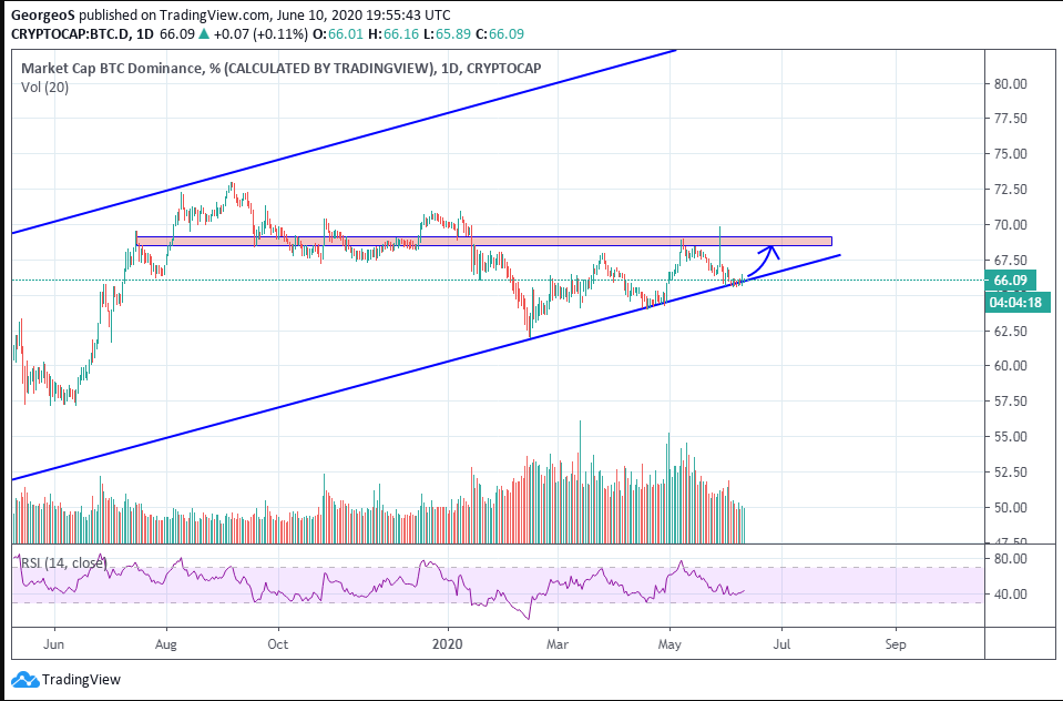 Tu si pozrieme 1D graf. Momentálne testujeme dlhodobú modrú trendovku. Osobne predpokladám, že sem príde čoskoro reakcia. Pri pohľade na tento graf jednoducho čakám na výraznejší odraz smerom nahor. Aj tento graf nám tak trošku napovedá, že čoskoro príde ten zásadný rozhodný pohyb, ktorý už dlhšiu dobu očakávame na BTC. Keďže predpokladám, že dominancia sa odrazí smerom hore, mal by do BTC pritekať nový kapitál, čo znamená, že by mala rásť aj cena BTC. Či to tak naozaj bude, to bohužiaľ povedať neviem. A hoci očakávam, že sa odrazíme smerom UP, stále je v hre ešte aj prepadnutie pod modrú trendovku a silnejší pokles dole. To by pravdepodobne znamenalo začiatok altcoinovej sezóny.