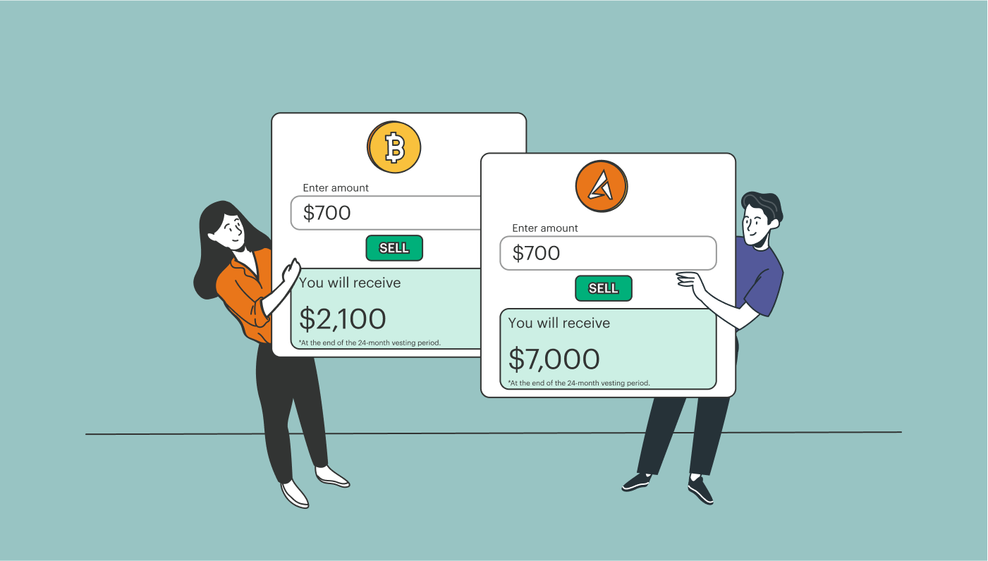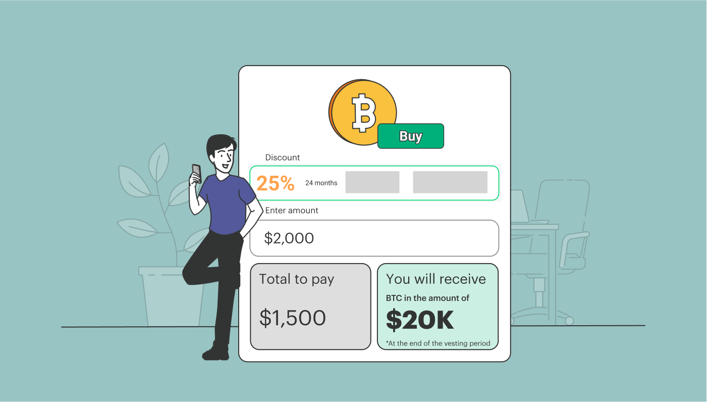 Ak sa napríklad rozhodnete kúpiť Bitcoin v hodnote 2 000 USD so zľavou 25 %, potom za svoj BTC zaplatíte len 1 500 USD. Celá hodnota Bitcoinu v hodnote 2 000 USD bude okamžite pripísaná na váš zostatok, hoci si ju budete môcť vybrať až na konci obdobia viazanosti.