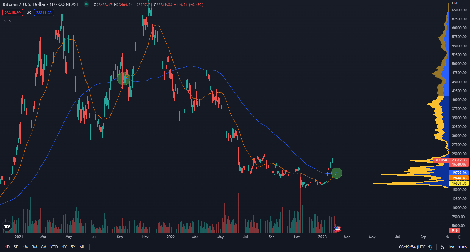Podľa údajov z TradingView vidíme, že bitcoin formuje prekríženie kĺzavého priemeru periódy 50 a 200. Ak na dennom grafe kĺzavý priemer MA 50 (oranžová krivka) prekoná kĺzavý priemer MA 200 (modrá krivka) zospodu nahor, hovoríme o zlatom kríži. Tento signál slúži na identifikáciu dlhodobej zmeny sentimentu a zároveň mnohí na jeho základe longujú.