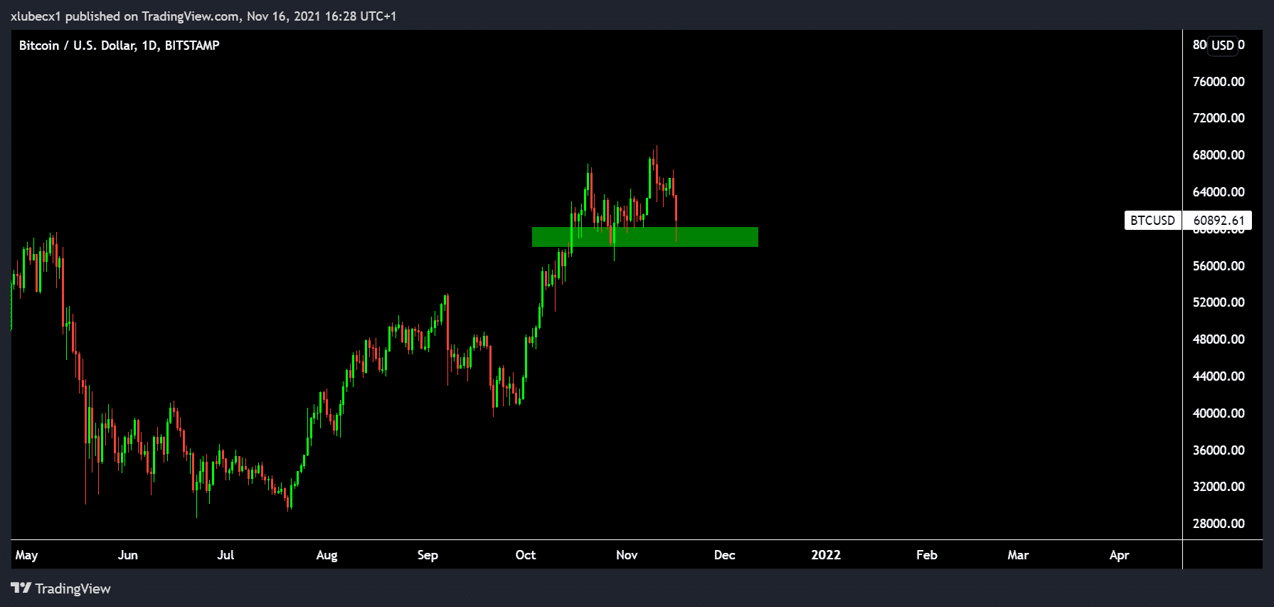 Žiadny trh nemôže rast večne bez korekcie. Aktuálne zaváhanie na trhu nemusí ešte znamenať, že treba predávať kým sa dá, lebo bude horšie. Na 60 000 USD máme na grafe silný support, ktorý zatiaľ odoláva a Bitcoin sa až na ranný rýchly fake out pohyb drží nad touto hladinou.