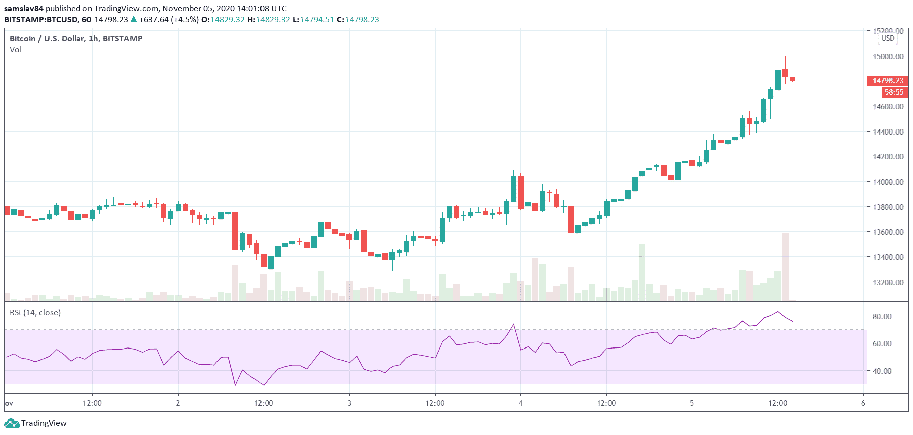 Zdá sa, že sa napĺňa predikcia, ktorú v pondelok na streame odprezentoval náš trader Ľubo Kovár. Nastal čas na ďalšiu rotáciu parabolického rastu a Bitcoin prerazil rezistenčné pásmo 12-14 500 $. Na burzách už stihol otestovať hladinu 15 000 $. Podľa Ľubovej analýzy je možné, že dosiahne ešte o tisícku viac. To by však už mal byť koniec. Vzhľadom na FOMO na trhu však konečná cena veľmi ľahko môže otestovať aj historické maximum. Teraz už nič nie je isté.