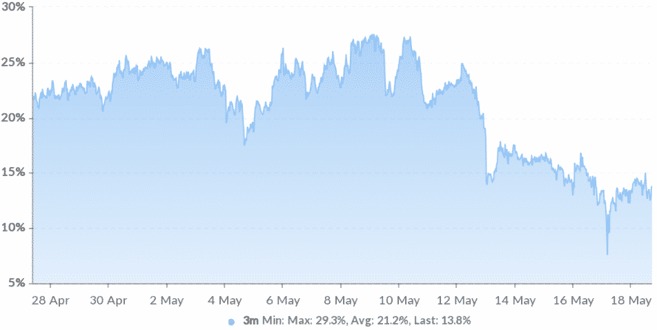 Všimnite si, že akonáhle úroveň 17 600 dolárov dokázala svoju silu, futures prémia vzrástla na 15%, čo naznačuje optimizmus.