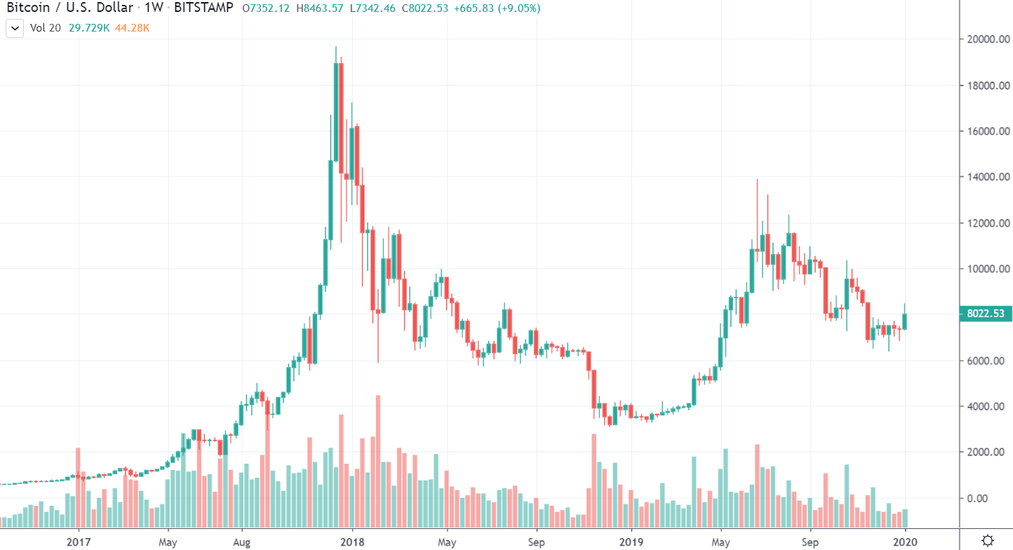 Bitcoin posledných šesť dní nerušene rástol, no každému bolo jasné, že skôr či neskôr musí prísť korekcia. 3.1.2020 vytvoril vyššie dno na cene 6800 $ a dnes zase nové, vyššie high na 8400 $. Vyššie sa už, bohužiaľ, nedostal.
