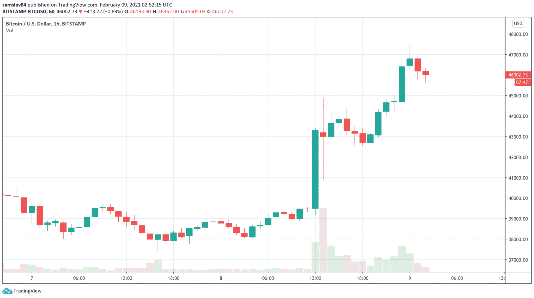 Poznáte to, keď si v noci odskočíte na záchod, v posteli potom na chvíľku mrknete na Bitcoin a on je na novom historickom maxime? Tak presne to sa práve stalo mne. V neskorých nočných hodinách totiž vystrelil na nové historické maximum a to „staré“ zo včera nechal hlboko pod sebou. Aktuálne to na Bitstampe ukazuje ATH 47 565 $, teda o cca 2500 $ vyššie, než hodnova z 8.2.