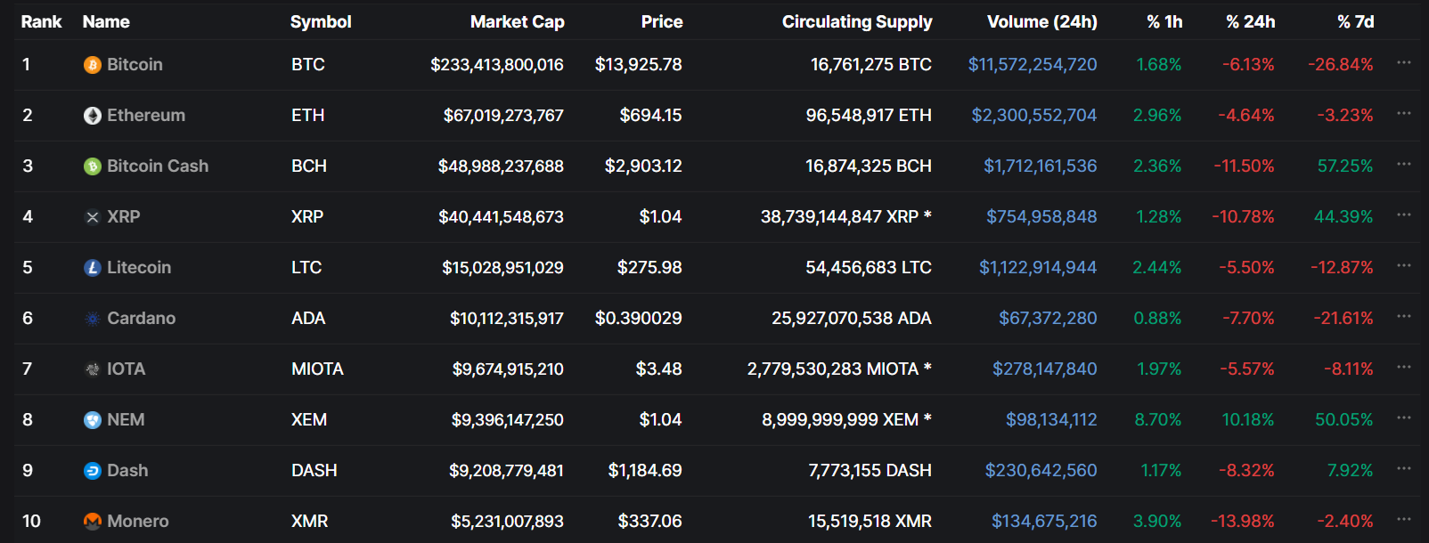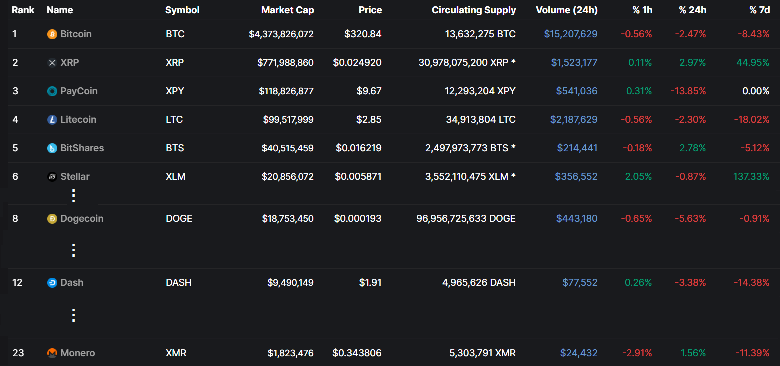 O rok neskôr už bol Bitcoin o 50% nižšie. Obchodoval sa za cca 320 $ a stále hľadal dno. To mimochodom našiel až o pol roka neskôr. Litecoin sa prepadol na štvrté miesto a stratil 80% hodnoty. Na vyšších miestach sa objavili anonymné coiny ako Dash či Monero.