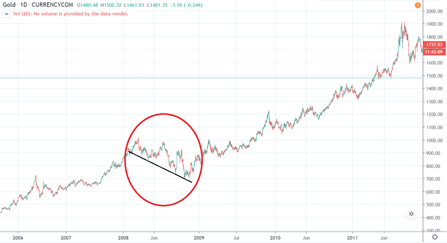 Podobne na začiatku krízy v roku 2008 to so zlatom nevyzeralo najlepšie. Z All Time High (1000 $) v priebehu niekoľkých mesiacov padlo o 30% na 700 $. Až potom prišiel ten veľký bullrun, ktorý skončil novým ATH na 2000 $. Zlato tak v priebehu krízy spravilo viac než stopercentný zisk, no v čase najväčšej paniky padalo.