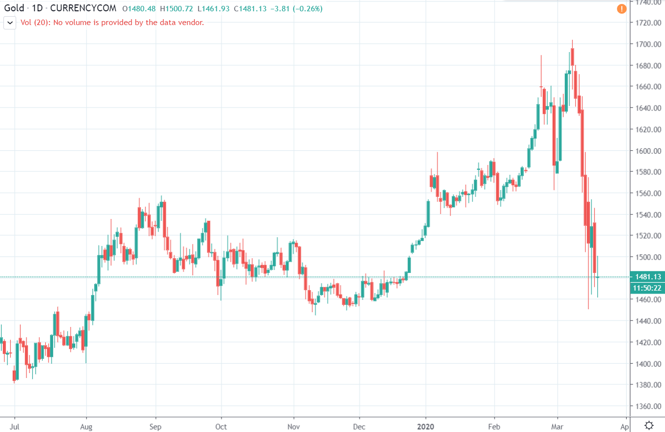 Napríklad zlato padlo z 1700 $ až na 1450 $! Aktuálne sa stále obchoduje veľmi blízko dna za 1481 $. Odolnosť voči pádom v čase najväčšej paniky rozhodne nie je charakteristikou bezpečného prístavu.