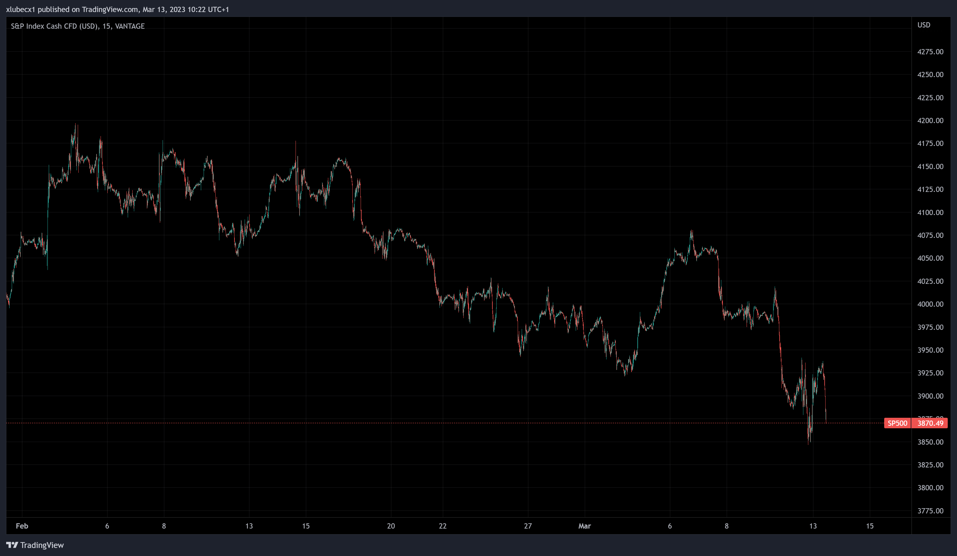 Najväčšie americké indexy v dôsledku posledných udalostí v bankovom sektore pokračujú v poklese. Okrem krachu bánk ku poklesu dopomohlo aj piatkové ohlásenie o nezamestnanosti v USA, ktoré bolo vyššie, ako sa očakávalo.