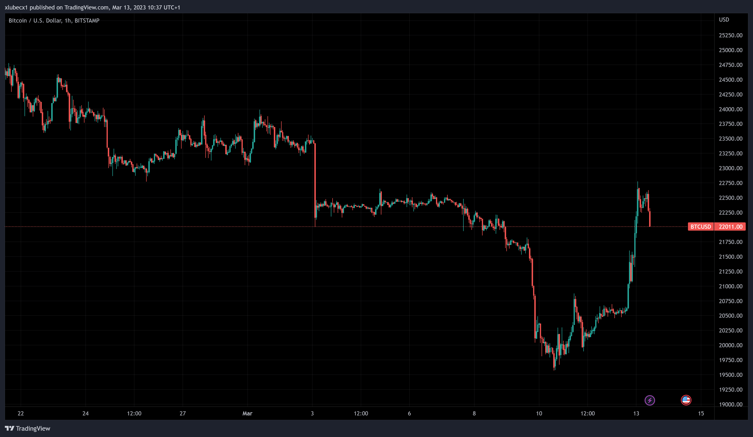 Od večera bitcoin vyrástol už o 10 % a zmazal značnú časť posledného poklesu. Trhu pomohol záchranný balík od spoločností Circle, ktorá sa rozhodla podporiť stablecoin USDC. Po krachu SVB prišli o 3,3 miliardy dolárov, ku ktorým sa nedostanú do momentu, dokým banka nebude zlikvidovaná. Balík záchrany má podporiť stabilitu a poslať stablecoin späť na hodnotu 1 dolára.
