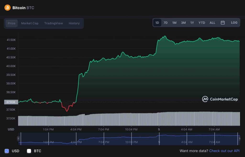 Cena BTC sa dokázala vyšplhať až o 12 %. V čase písania tohto článku sa Bitcoin obchodoval na úrovni 41 500 USD, kde sa vytvoril lokálny support.