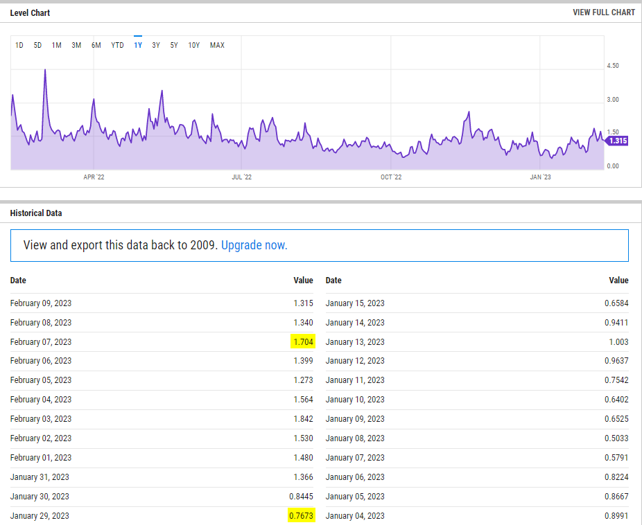 Údaje z Ycharts ukazujú, ako sa bitcoinové poplatky dostali z hodnoty 0,767 dolárov dňa 29. januára na hodnotu 1,704 dolárov dňa 7. februára. Medzitým v posledných dvoch dňoch začali poplatky opäť mierne klesať. Zaujímavosťou je, že bitcoin v tomto období nezaznamenal žiaden cenový nárast a graf sa pohyboval v bočnej štruktúre v nízkej volatilite. Čo bolo potom dôvodom tohto rastu?