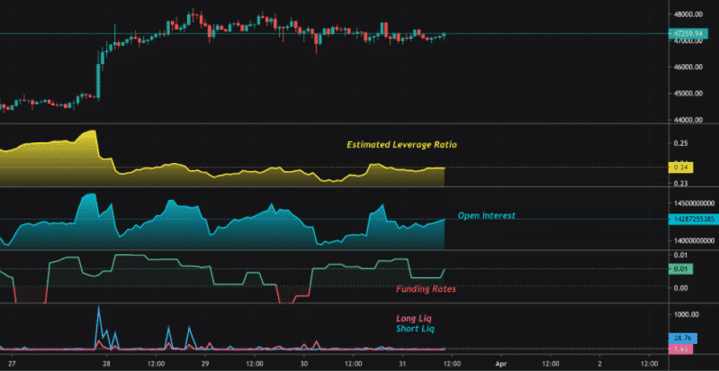 Ako môžete vidieť vo vyššie uvedenom grafe, bitcoinový pákový pomer mal pred niekoľkými dňami vysokú hodnotu, ale prudký vzostupný trend v cene kryptomien ho priviedol späť nadol, pretože likvidoval shorty.