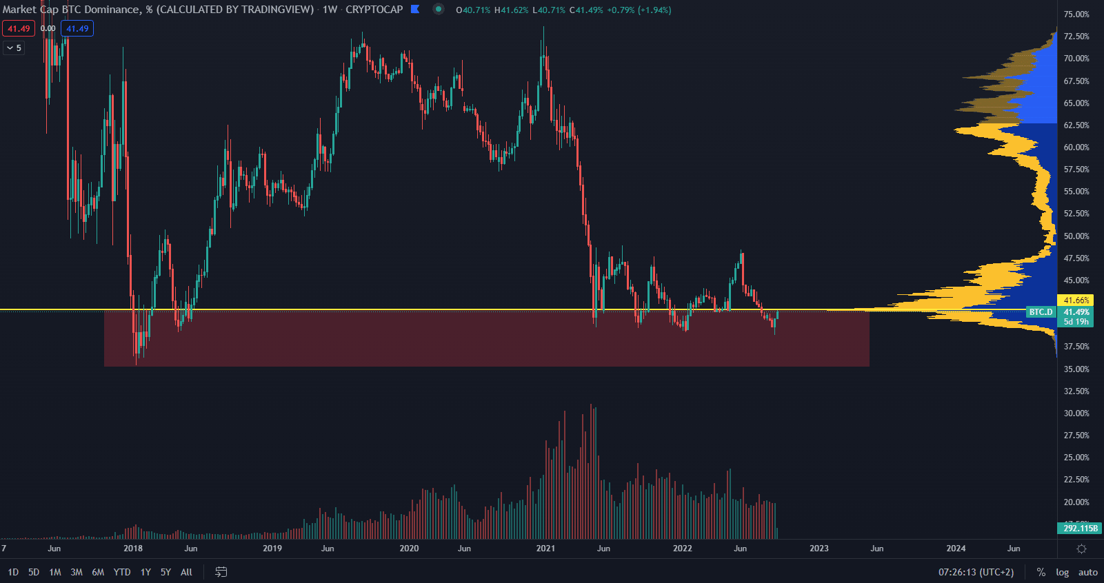 Problém, ktorý čoraz viac trápi bitcoinových maximalistov, je klesajúca dominancia z dlhodobého hľadiska. Dominancia Bitcoinu sa v čase písania nachádza na hladine 41,50 % a odrazila sa od minima 38,84 %, čo je jedna z najnižších úrovní v histórii. Nižšia dominancia sa vyskytovala v minulosti iba v januári a februári 2018. Ďalšou dôležitou otázkou je, ako zareaguje bitcoinová dominancia vo vzťahu k ethereovej, po uvedení aktualizácie The Merge.