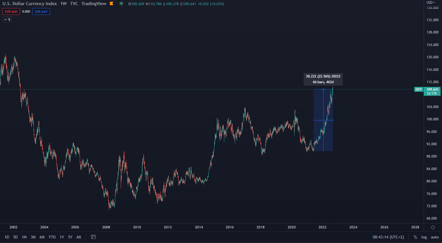 Jedným zo základných ukazovateľov možného prepadu Bitcoinu je aj stále silnejší dolár. Dolárový index DXY kontinuálne vykazuje extrémnu silu. Ako vidíme na grafe nižšie, index sa vyšplhal raketovo na 20-ročné maximum, čo predstavuje rast o 22,50 % len za zhruba 460 dní.