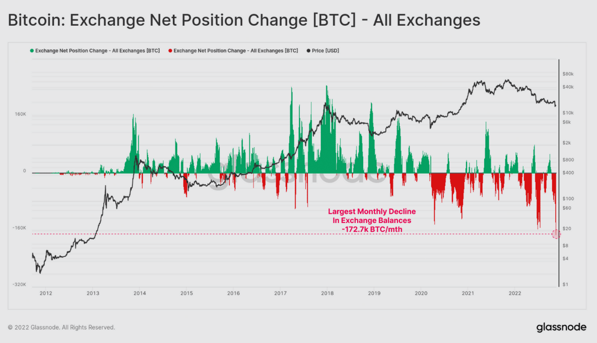 Výsledkom je, že 30-dňová čistá pozícia zostatkov všetkých kryptomenových búrz dosiahla v odlivoch nové historické maximum. Z búrz zmizlo v priebehu jediného mesiaca až 172 700 BTC podľa najnovšej správy od Glassnode. Túto skutočnosť zobrazuje graf nižšie.