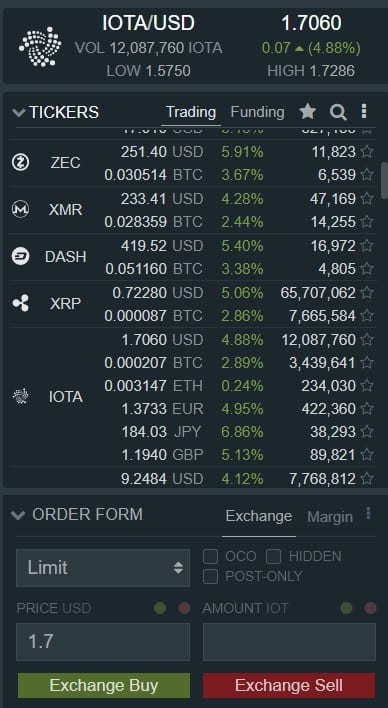 Krok 1: Uistite sa, či vaše finančné prostriedky sú v peňaženke ‚Exchange‘. Pretože Bitfinex používa tri špeciálne peňaženky pre každú z funkcií stránky (Exchange, Margin, Funding). Peniaze môžete okamžite presunúť z jednej peňaženky na druhú na stránke ‚Wallets‘.