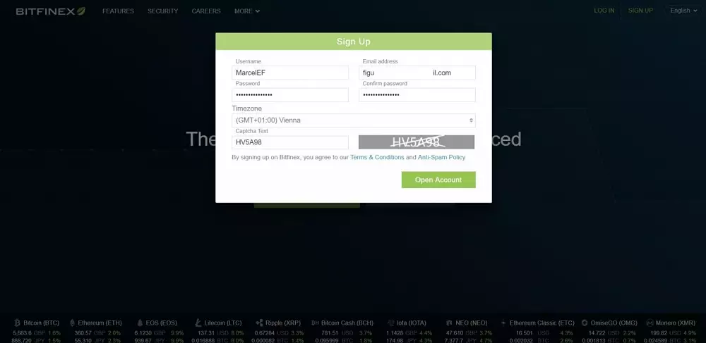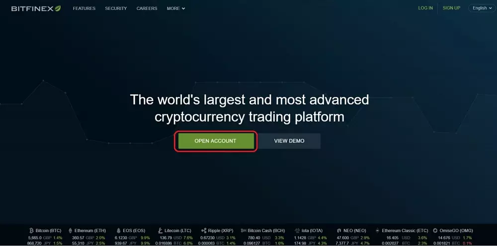 Krok 1: Otvorte si stránku Bitfinex.com a kliknite na tlačidlo OPEN ACCOUNT.