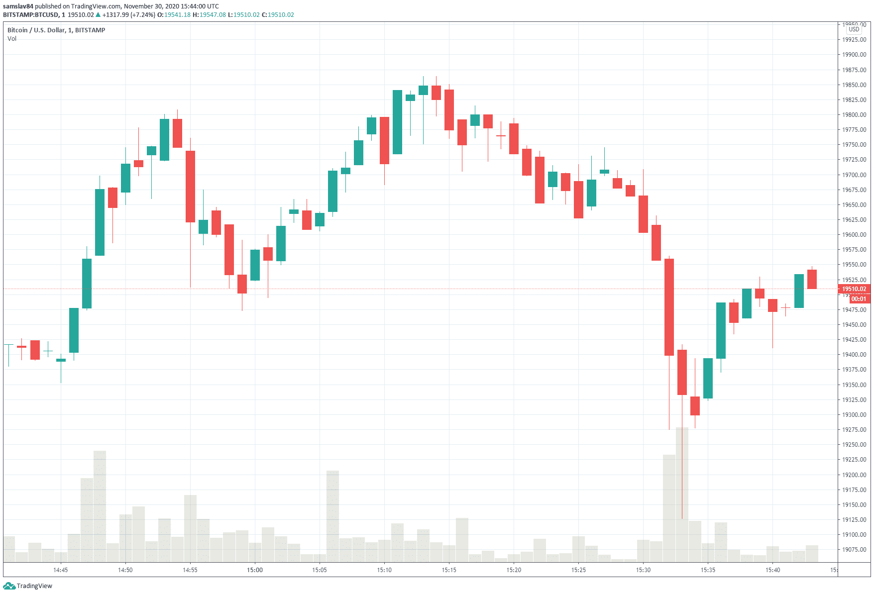 Všimnite si aj masívnu volatilitu tejto kryptomeny, ktorá je najlepšie viditeĺná na minútovom grafe. Celý graf (dole) reprezentuje cenový vývoj za poslednú hodinu. Za ten čas bitcoin stihol vystúpiť z 19 400 $ na 19 800 $, klesnúť späť na 19 400 $, vytvoriť nové high na 19 865 $, klesnúť na 19 125 $ a aktuálne sa obchoduje za cca 19 500 $… Šialené.