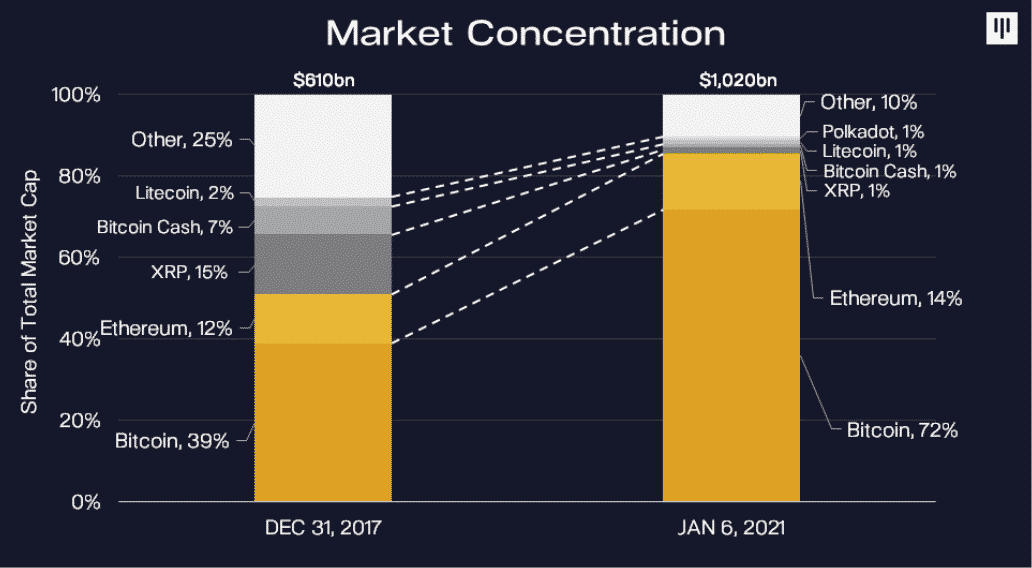 Stále viac analytikov v poslednej dobe hlási, že rastúca dominancia Bitcoinu a Etherea nad zvyškom trhu s kryptomenami naznačuje, že tento bullrun bude diametrálne odlišný, ako všetky ostatné. Dominancia kvalitných coinov počas neho bude rásť vďaka prílivu kapitálu od inštitucionálnych investorov do trhu.
