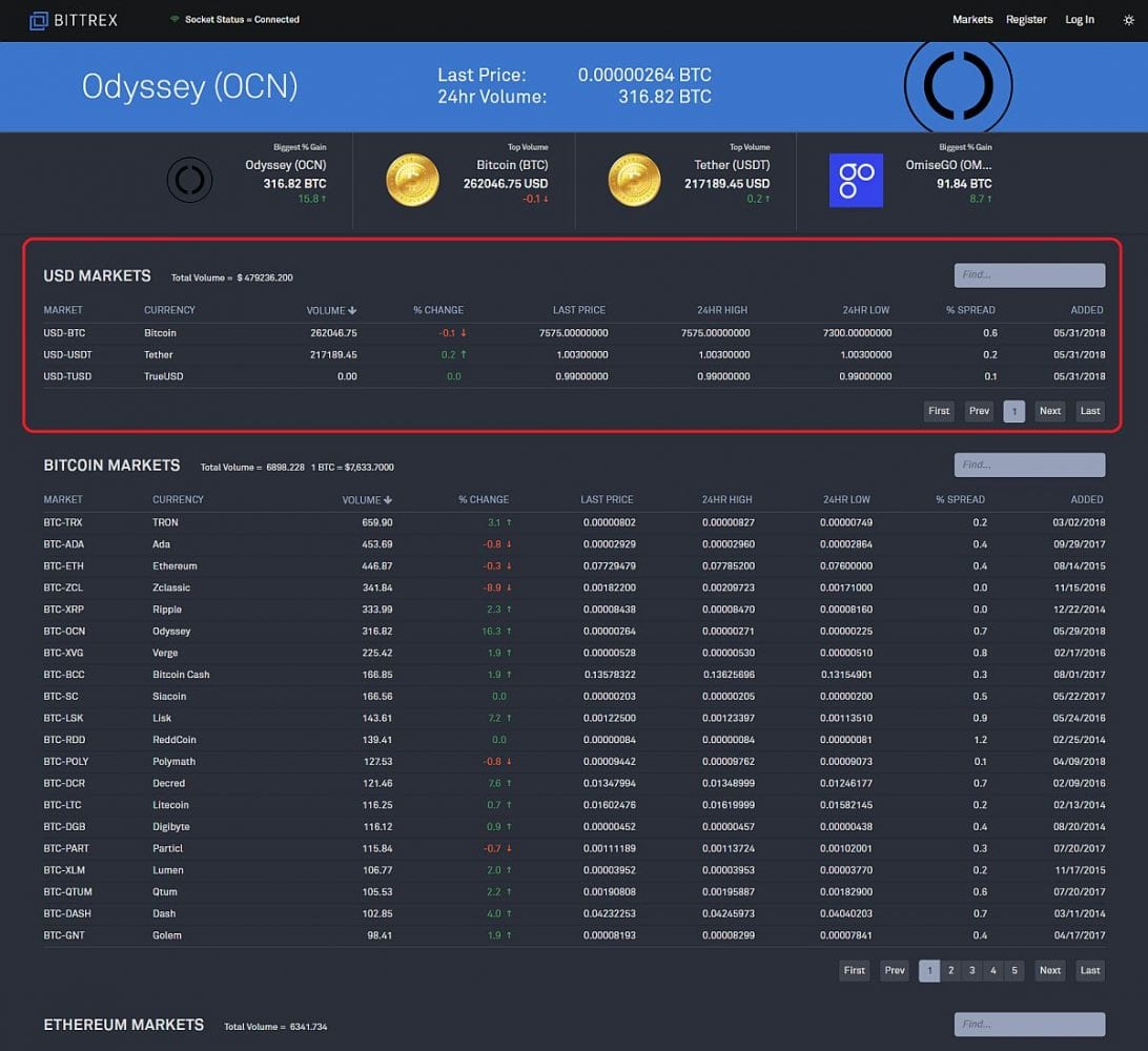 Je tu však jeden problém. Môžeme Tetheru veriť? Je naozaj stopercentne krytý fiatom? Existuje možnosť, že Tether skrachuje? Je to veľmi nepravdepodobné, no ako nezávislá burza by ste sa nemali spoliehať na dobrú vôľu konkurenčnej firmy. Bittrex preto vrámci diverzifikácie rizika začal experimentovať s ďalšou kryptomenou kryptodolárom – True USD (TUSD) a s reálnymi dolármi. Môžete si to sami pozrieť po rozkliknutí tlačidla markets na hlavnej stránke burzy, prípadne kliknutím na tento link.
