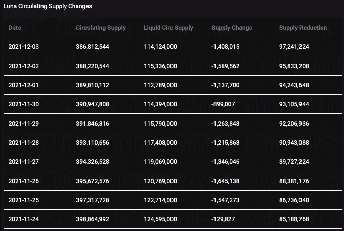 Ak sa pozrieme na spaľovací proces ETH, ktorý začal v auguste, doteraz sa spálilo viac ako 1,1 milióna ETH. Táto hodnota však predstavuje iba 1 % z celkovej ponuky 117,8 miliónov. V prípade tokenu LUNA bolo za posledných 10 dní zaznamenaný pokles celkovej ponuky o viac ako 1,4 %. Masívny spaľovací proces je teda s veľkou pravdepodobnosťou zodpovedný za pozitívny cenový rast.