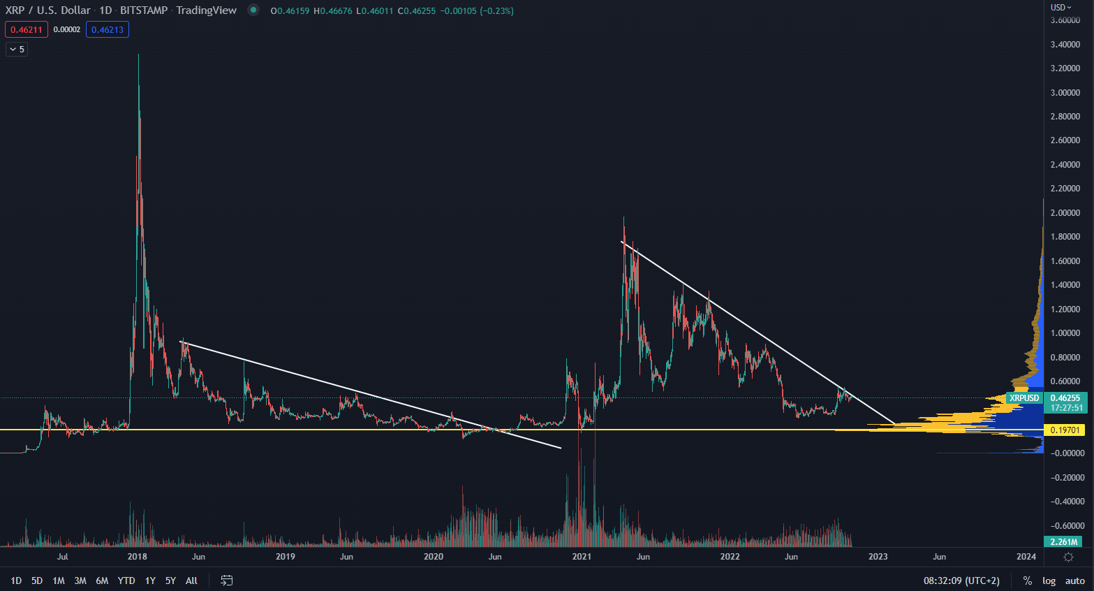 Ako vidíme na grafe vyššie, cena XRP sa pohybuje priamo na dlhodobej rezistencii, ktorá je aktuálna od vytvorenia maxima z apríla 2021. Podobnú štruktúru trhu cena formovala aj v minulosti, čo by mohlo znamenať, že vytvorenie dlhodobého dna ešte istý čas potrvá a ubehnú mesiace, kým sa trend obráti na dlhodobo rastúci.