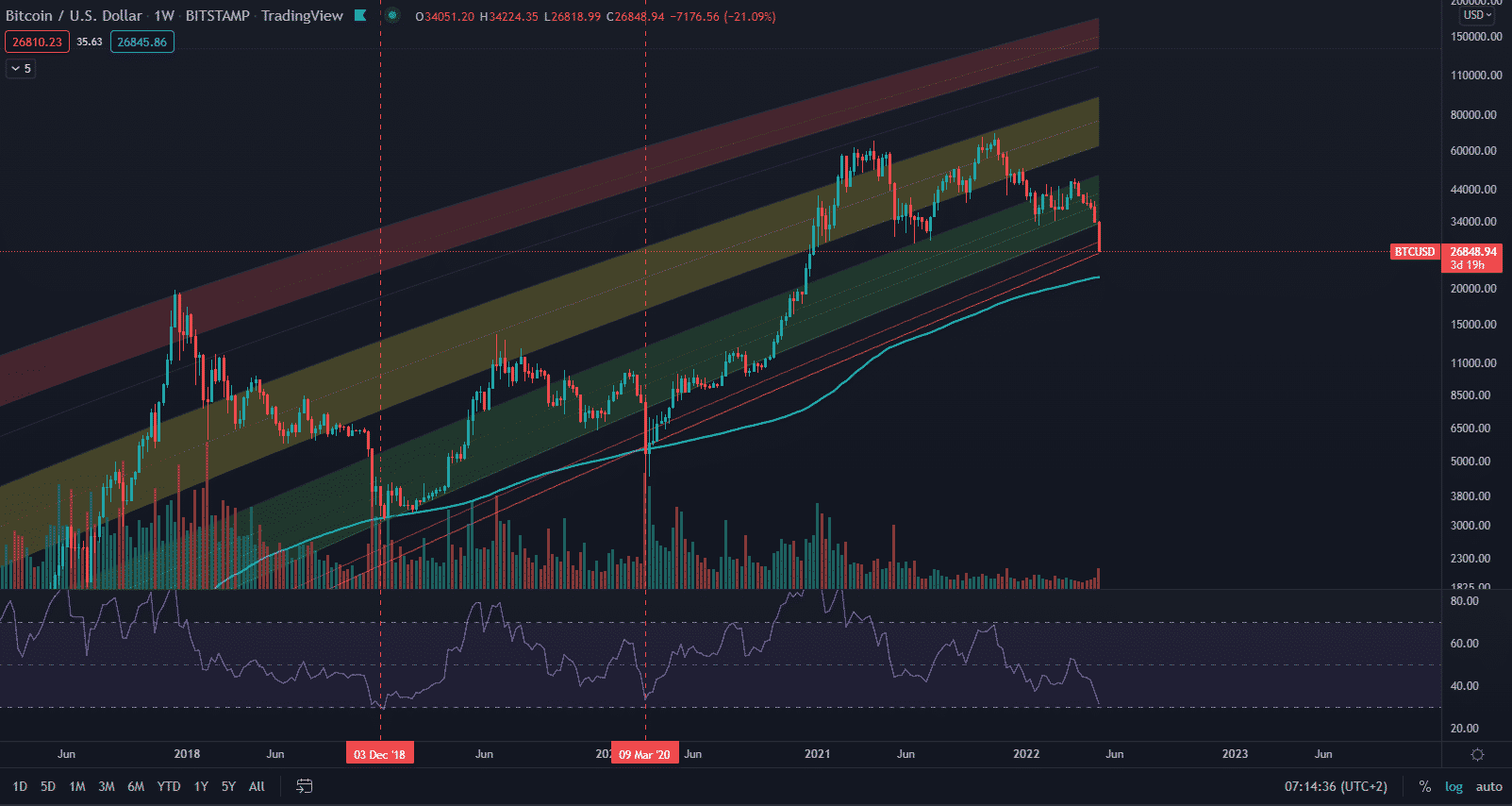 Na týždennej úrovni je teraz hlavná úroveň supportu na hladine 22 000 $. Každý, kto sleduje digitálne aktívum, vie, že hlavným supportom bola v minulosti MA200. Dokonca aj v roku 2014 sme videli podobný scenár a Bitcoin otestoval MA200 v januári 2015.