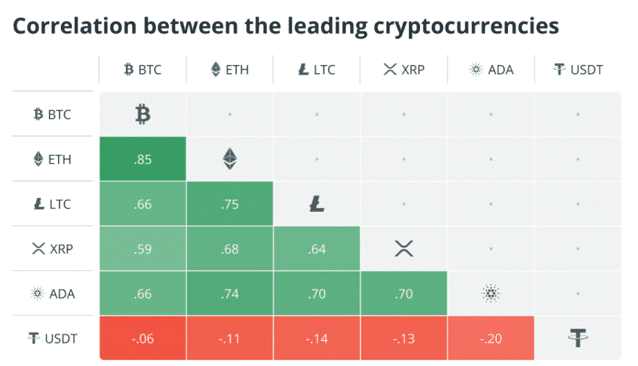 Ďalším argumentom pre klasifikovanie „Bitcoin vs. altcoiny“ sú rôzne korelácie medzi BTC a inými coinmi. Zatiaľ čo v rámci niektorých párov je korelácia vysoká, iné vykazujú slabšiu vzájomnú závislosť. Napríklad ADA a XRP vykazujú nižšiu koreláciu s inými digitálnymi aktívami. Nehovoriac o tom, že stablecoiny ako Tether (USDT) vykazujú negatívne korelácie.