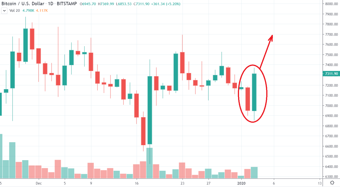 To sa stalo aj krátko po novom roku, keby kráľ kryptomien zaznamenal ďalší pokus medveďov o zrazenie ceny. Ani tento však nevyšiel a Bitcoin aktuálne na daily grafe tvorí obratovú formáciu bullish engulfing, pri ktorej je červená sviečka úplne pohltená nasledujúcou zelenou daily sviecou.