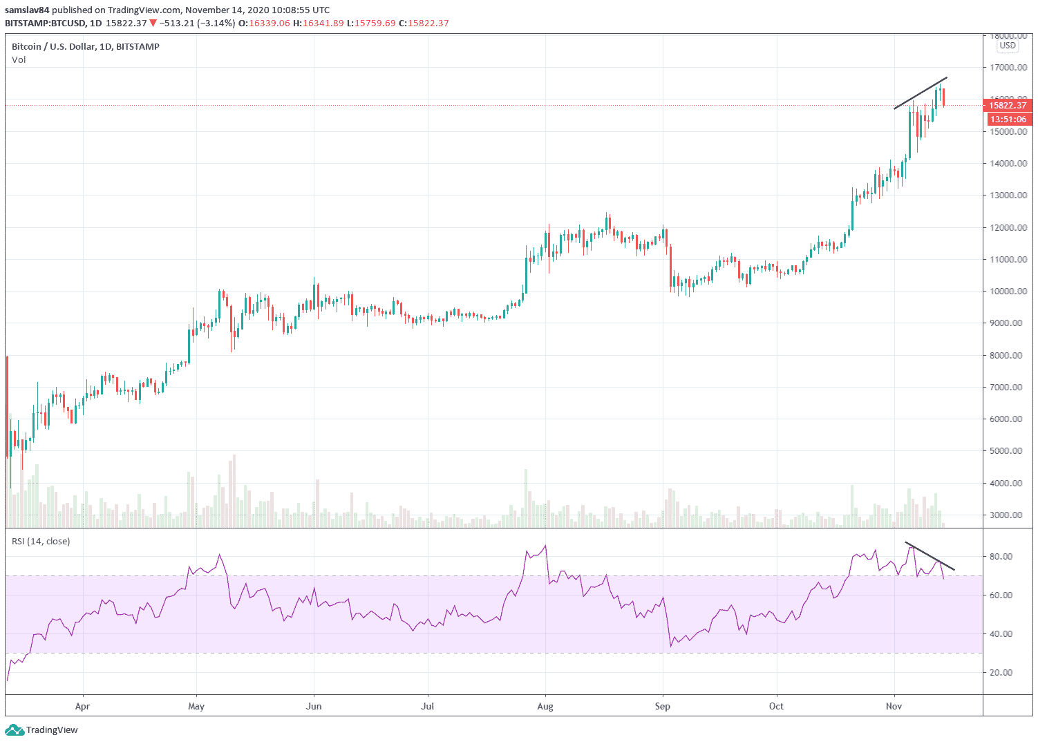 Bitcoin sa pohybom nad 16 000 $ dostal do extrémne prekúpenej zóny. TradingView indikátor ukazuje strong buy, Fear & Greed indikátor varuje pred chamtivosťou na trhu, na grafe sa takmer na všetkých timeframoch vytvorili RSI a MACD rezistencie, volume na burzách postupne klesá…