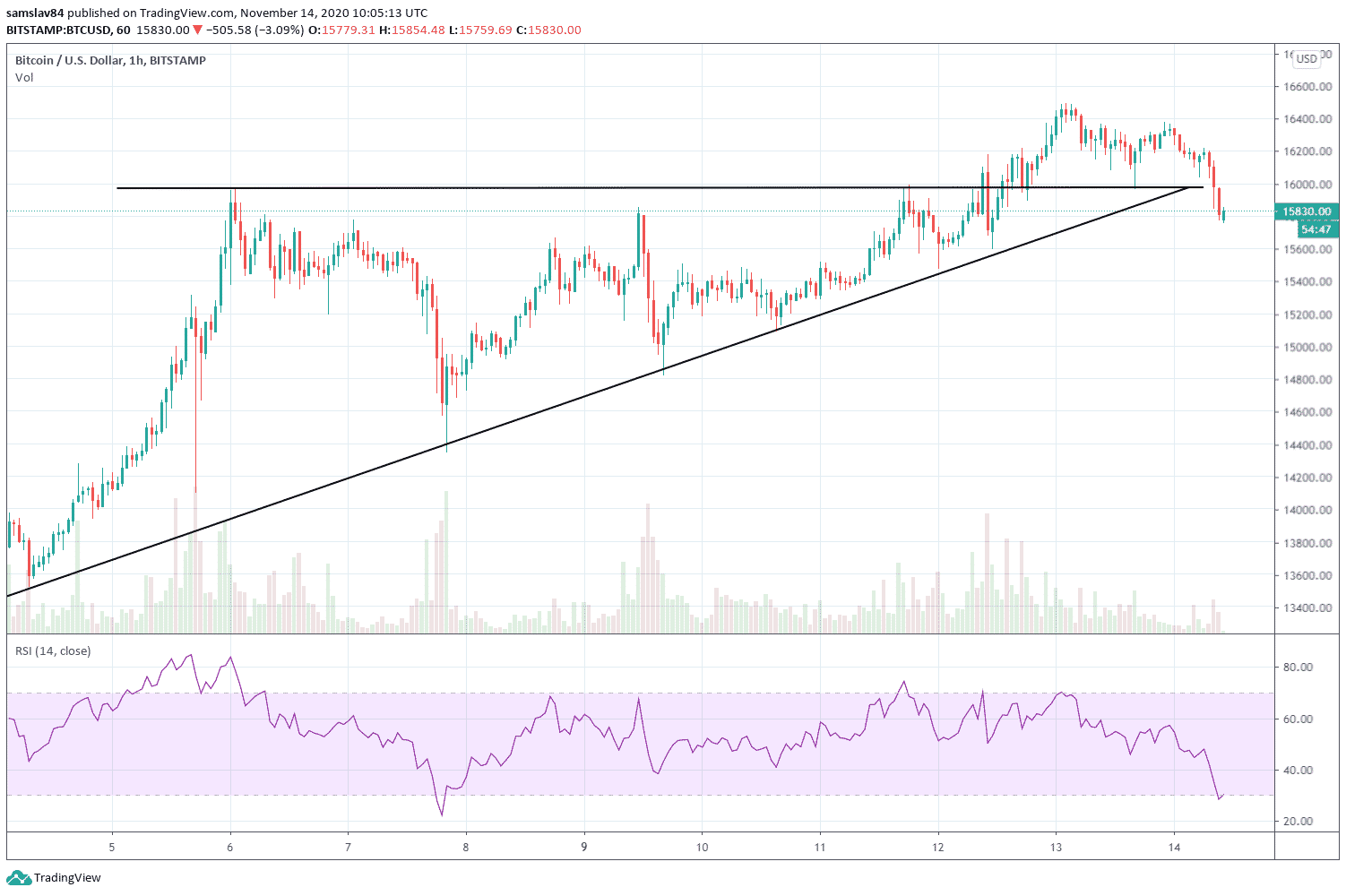 Bitcoin včera prekvapil novým tohtoročným maximom. Otestoval hladinu 16 500 $, následne potvrdil support na 16 000 $ a opäť sa vybral smerom hore. Vyzeralo to dosť dobre, ale dnes sa už ukazuje, že trh nie je ochotný objavovať vyššie ceny. Aktuálne už opäť klesáme.