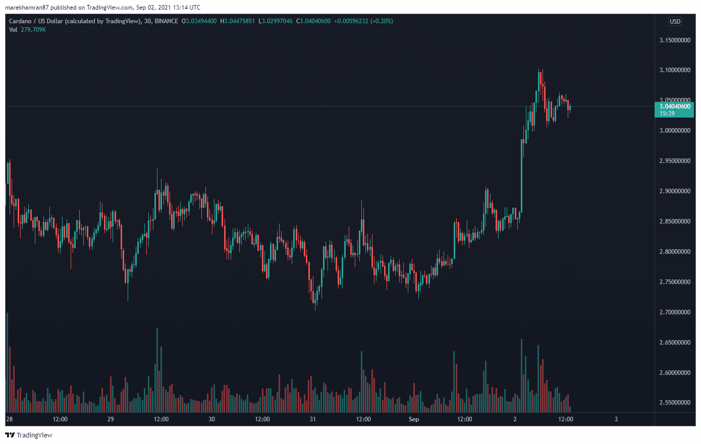 Prvá fáza dôležitého projektu Alonzo bola práve spustená. Sieť Cardano od dnes ponúka inteligentné kontrakty, zatiaľ však len na Testnete. A ako reaguje cena tokenu ADA? Dosahuje stále vyššie a vyššie historické maximum. V čase písania tohto článku bola cena ADA na úrovni 3,03 USD.