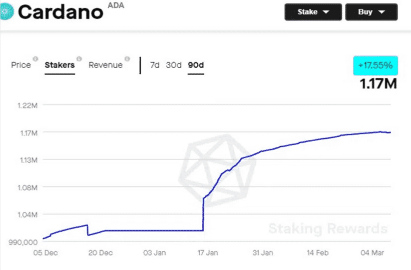 Prvý deň v roku 2022 bol celkový počet stakerov na úrovni 54 772 a 18. januára sa tento údaj znížil na 54 768. Počas celého februára sa počet stakerov nejako extrémne nezmenil. V porovnaní s Cardanom je to veľmi nízke číslo.