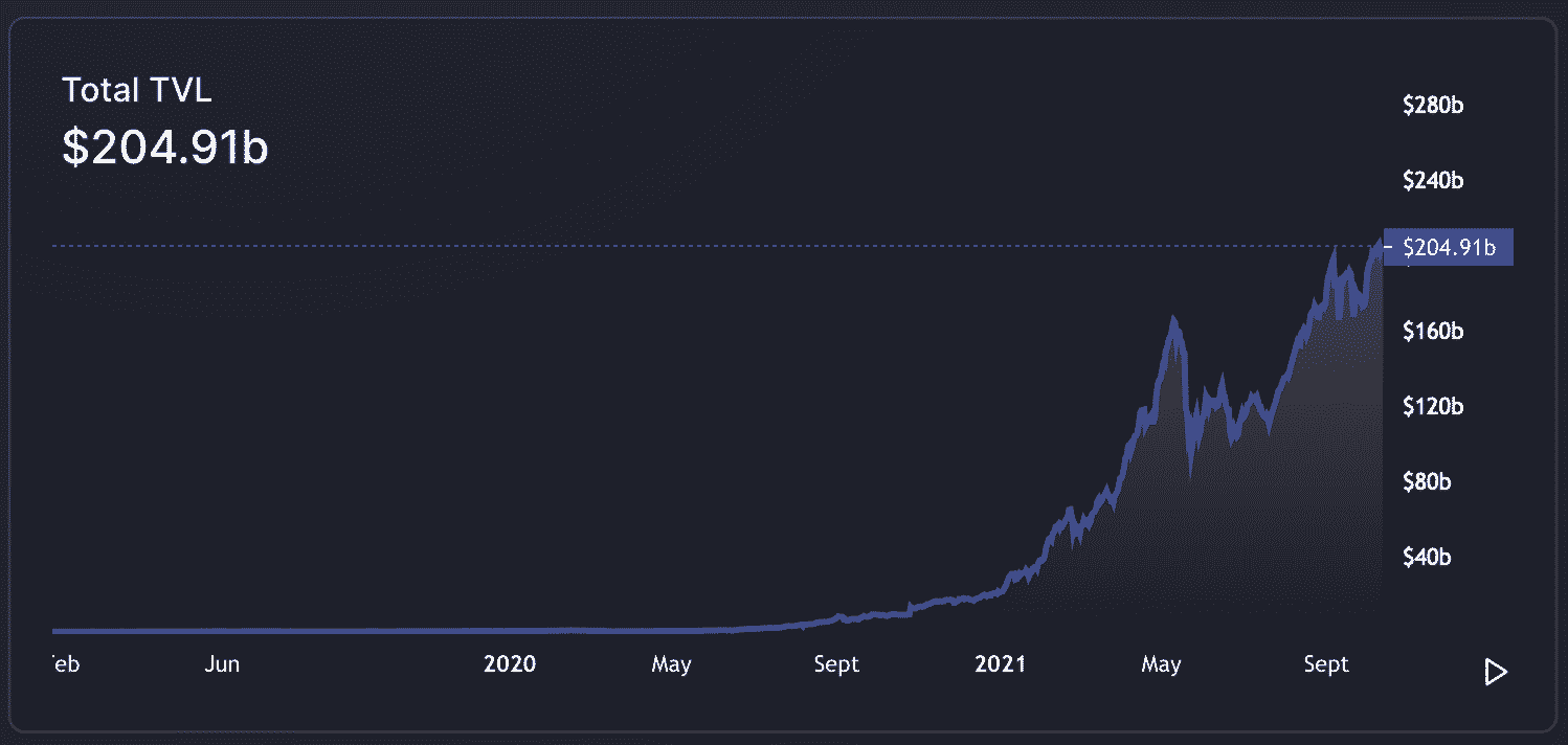 Najnovšie údaje poskytol portál DeFiLlama, podľa ktorého je súčasná viazaná hodnota DeFi protokolov na úrovni 200 miliárd dolárov. Zaujímavé je, že od konca júna sa táto hodnota viac ako zdvojnásobila.