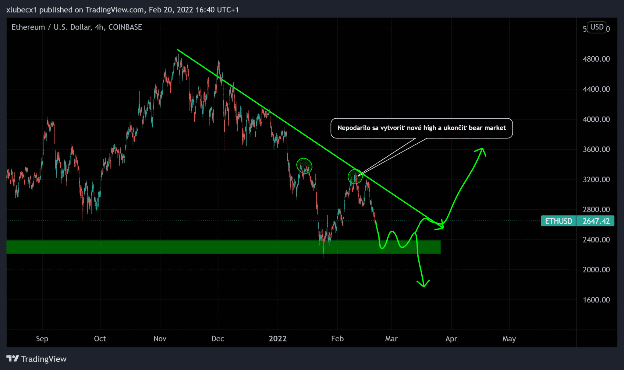 Dával by som si pozor aj na prípadný break out supportu na 2 000 USD. Zatiaľ je menej pravdepodobný, to ale neznamená, že nemôže prísť. Situácia na Ukrajine je veľmi nestabilná a všetky trhy od indexov cez akcie až po kryptomeny reagujú na tento fundament zatiaľ poklesom. Ak by sa stav skomplikoval, prípadne by začala vojna, tak nemám pochyby, že pokles môže byť ešte hroší ako ten, ktorý sme mohli sledovať počas koronakrízy.