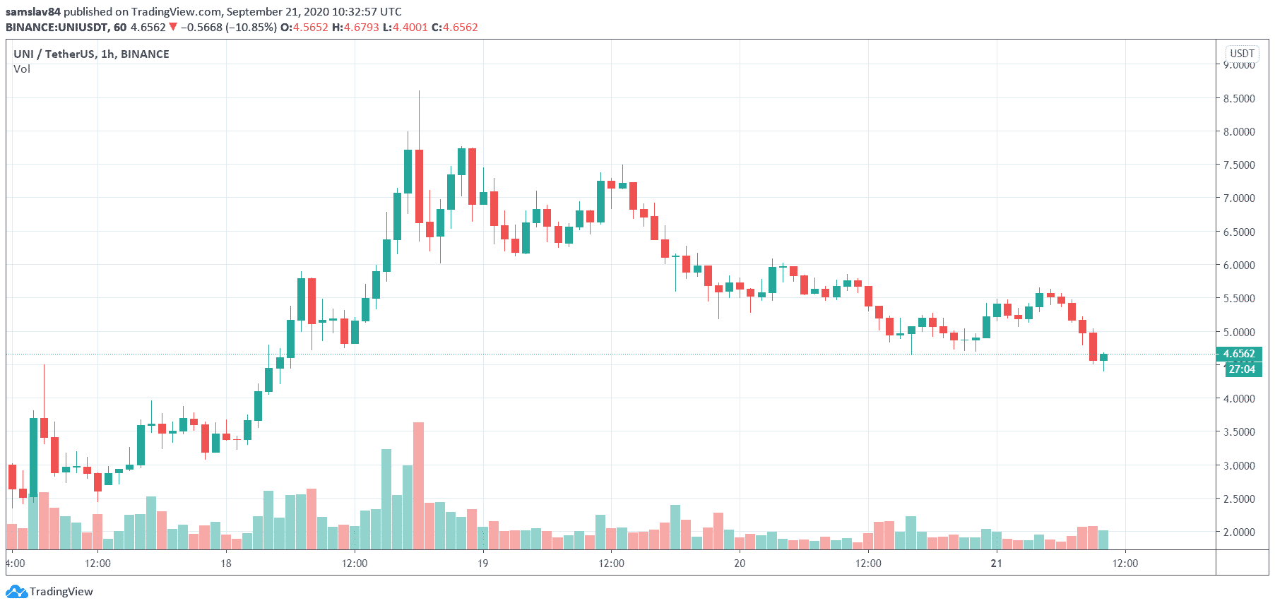 Uniswap token UNI minulý týždeň spravil veľký poprask na trhu s kryptomenami. Kryptomena najväčšej decentralizovanej burzy má obrovský úspech a po príchode na klasické zmenárne sa jej hodnota veľmi rýchlo strojnásobila. Z 2,5 $ vyrástla až na 8 $. Cez víkend však hype trochu ochladol a po korektívnom pohybe sa obchoduje za menej než 5 $.