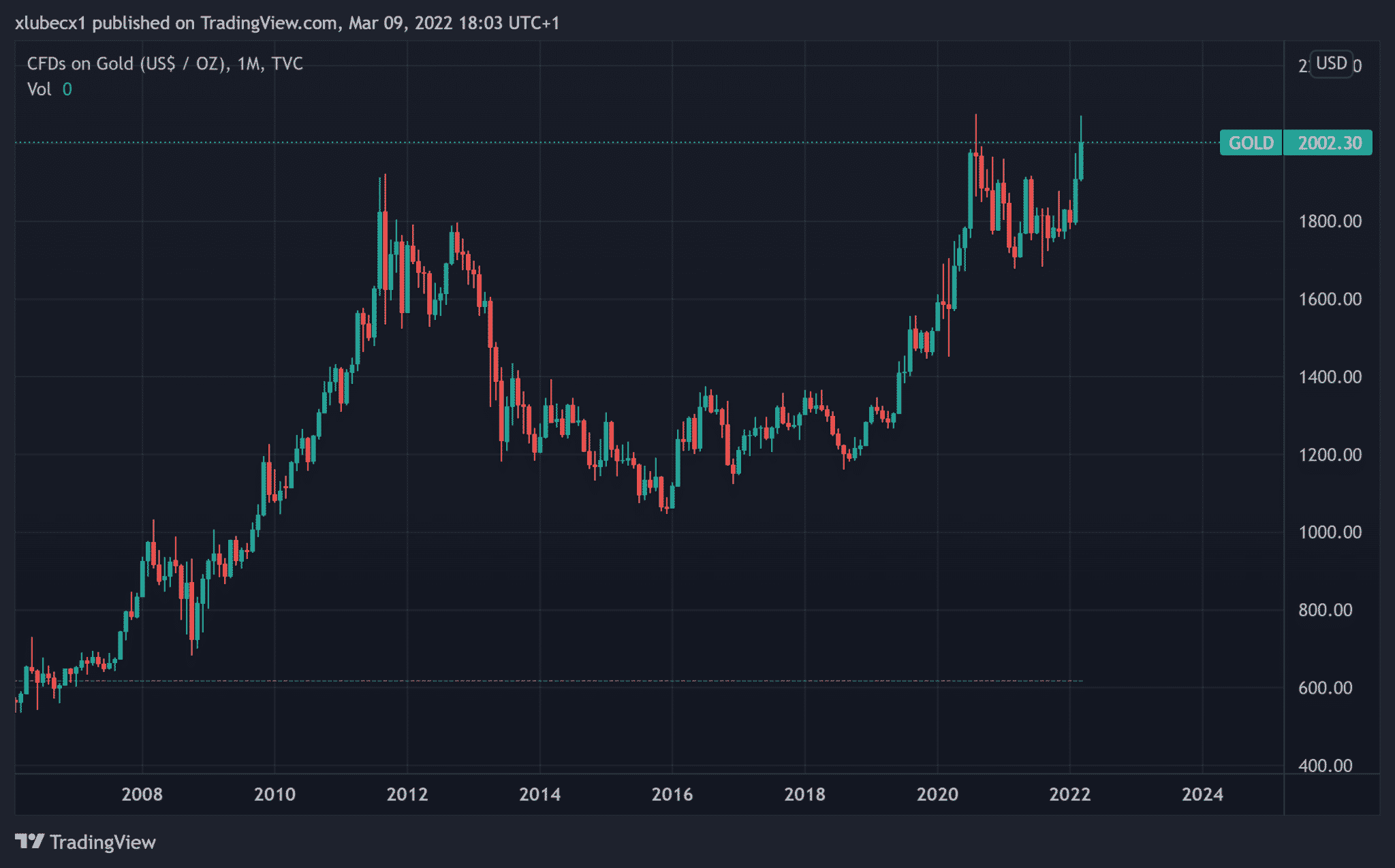 Zlato sa obchodovalo v minulosti približne iba jeden týždeň nad 2 000 dolármi. Prekonanie tejto historicky aktuálne najsilnejšej rezistencie môže znamenať ďalší špekulatívny nárast. Nedá sa vylúčiť, že cena sa nad touto úrovňou stabilizuje aj dlhodobo a vytvorí sa tu silný supportny level.