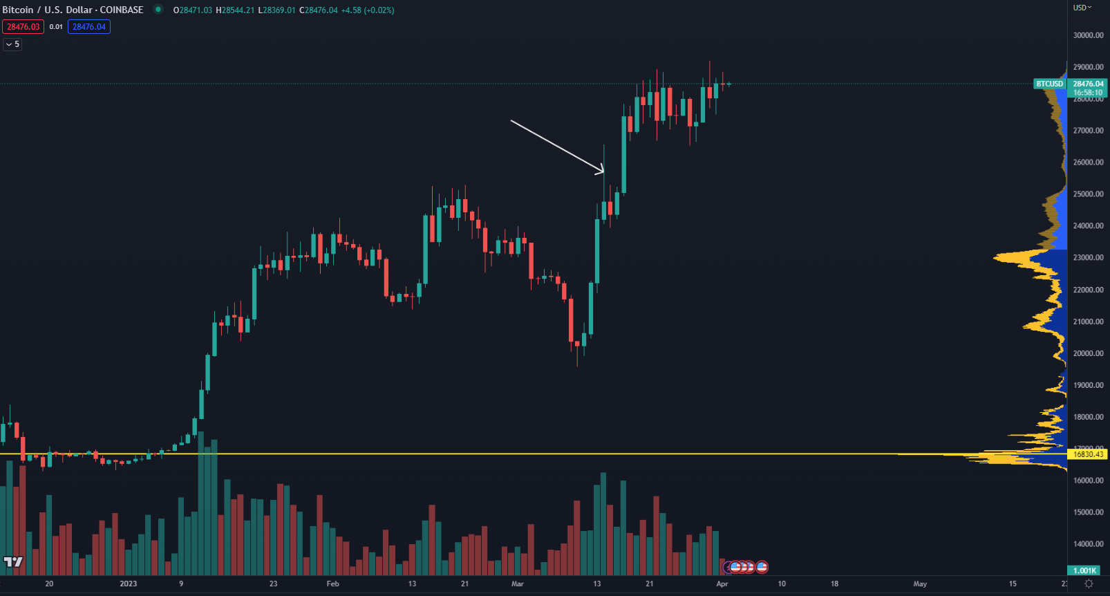 Napriek tomu môžeme vidieť 14. marca na trhu vysoký horný knôt sviečky, ktorý predstavuje veľký denný výkyv. Inak povedané, cena v daný deň prudko rástla, no nakoniec boli takmer celodenné zisky vymazané. Takže áno, podobné udalosti môžu spôsobiť volatilitu, ale len krátkodobú.
