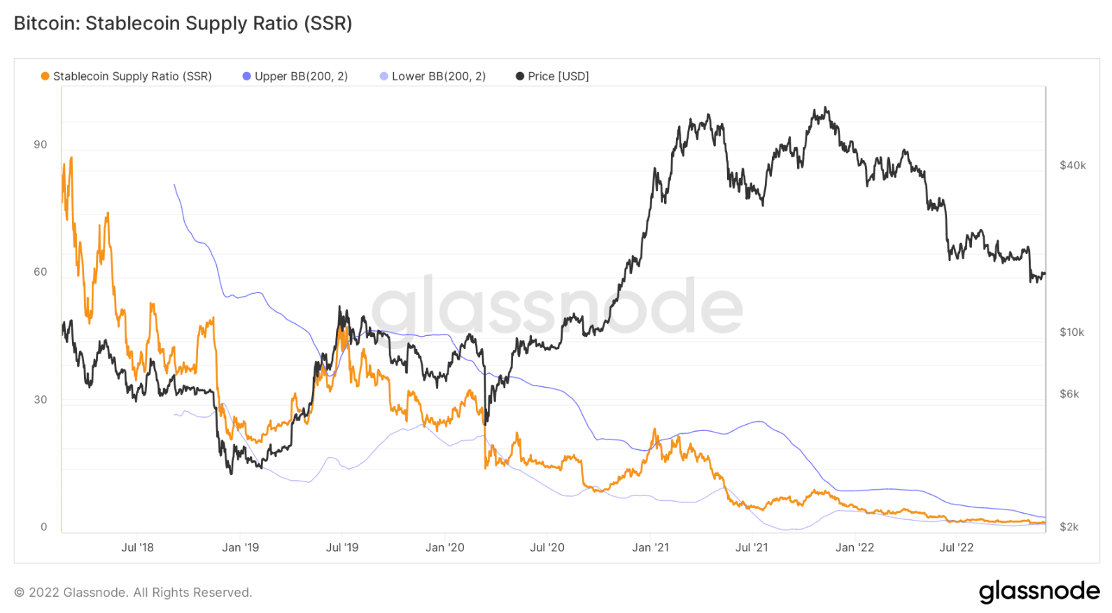Stablecoiny predstavujú ekvivalent k fiatovým menám, takže v podstate je ich úlohou zabezpečovať likviditu na trhu s kryptomenami. Z tohto dôvodu je celková ponuka stablecoinov v obehu veľmi dôležitá. Celkový pomer ich ponuky a kapitalizácie tak môže naznačovať buď potenciálny rast, alebo, naopak, pokles cien. Pomer kapitalizácie BTC voči stablecoinom definuje indikátor s názvom „Stablecoin Supply Ratio” z dielne spoločnosti Glassnode.